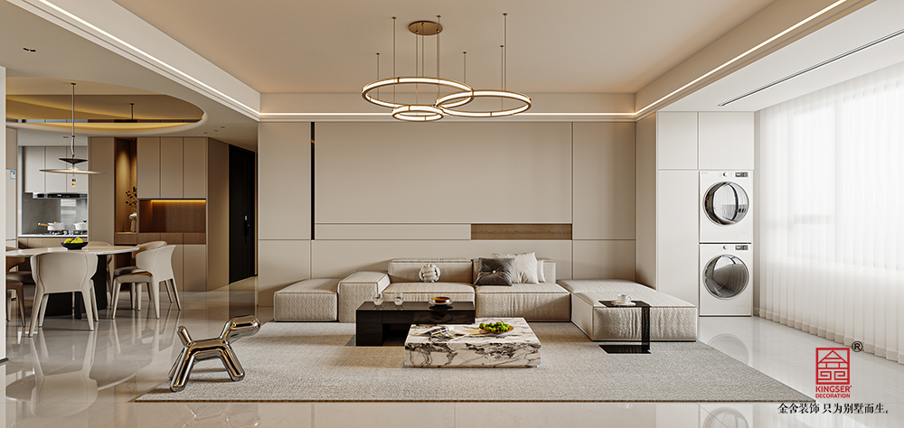 将传统中式元素和现代元素巧妙结合的新风格,开放式空间布局,追求平衡与和谐,设有中轴线,空间分割灵活。