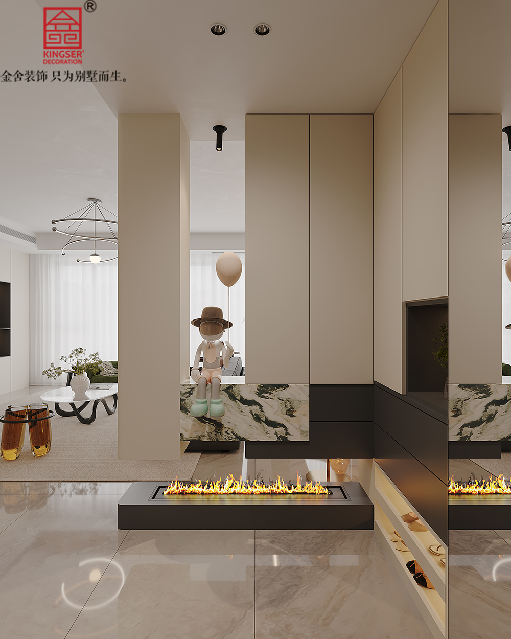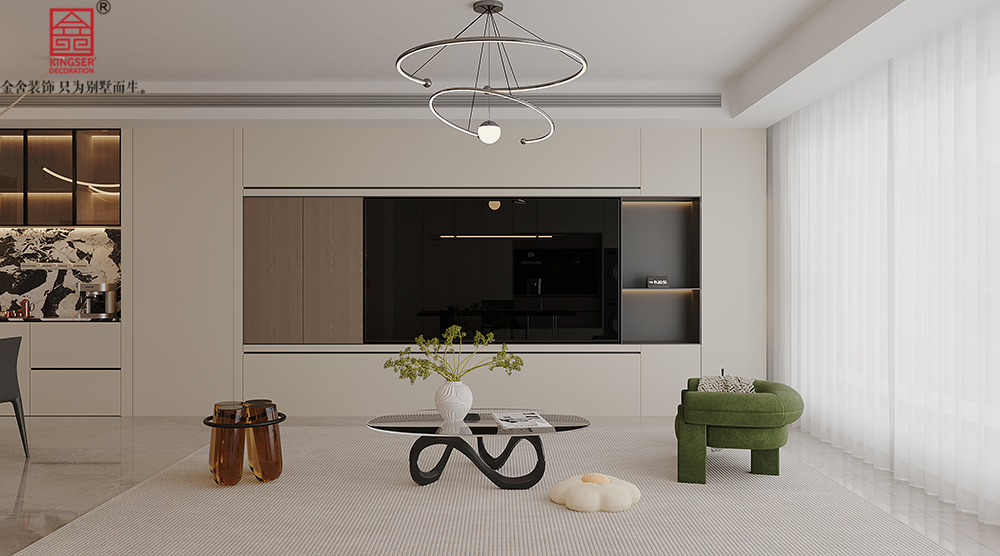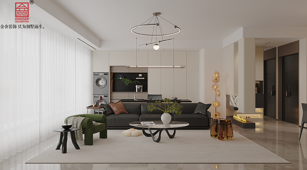 采用开放式的布局,弱化了空间的边界感,围绕以“沙发+茶几+地毯”的核心形成的休闲区,整体客厅动线流畅完整,整体通透感与互动感十足。