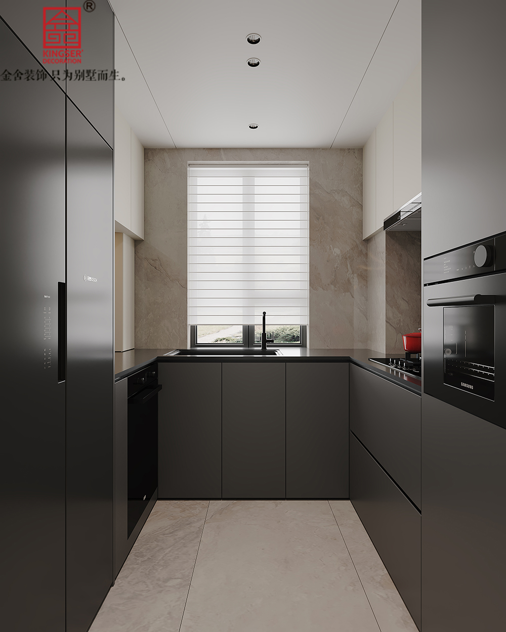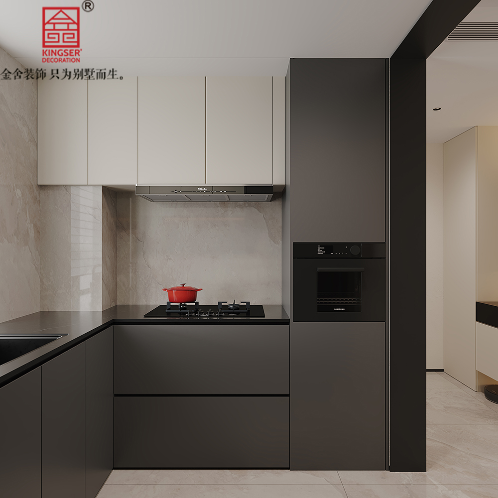 以简洁的线条,高级的灰调为主,搭配石材质感的墙面瓷砖,嵌入式家电与整体完美融合。