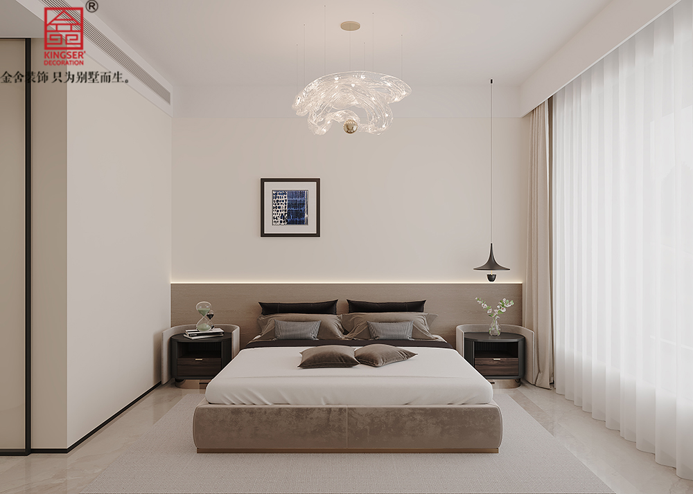 以柔和的色调陈铺空间,精致吊灯如艺术佳作,搭配简约挂画与质感床具,营造出静谧又高级的休憩氛围。