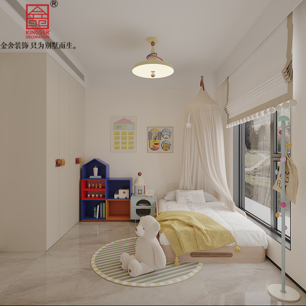 充满童趣的儿童房,柔和色调搭配可爱装饰,多彩置物架与萌趣挂画相映成趣,完整的活动空间为孩子打造出一片自由美好的小天地。