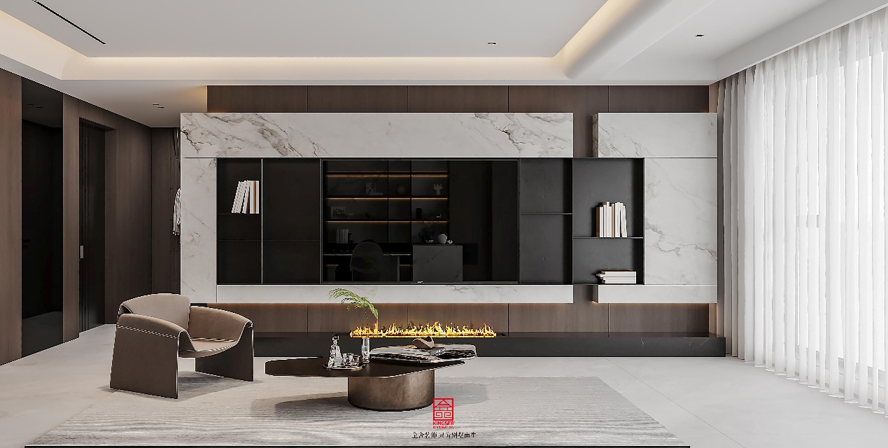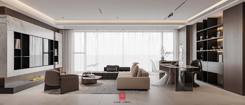 总的来说,这个客厅通过色彩、材质、布局和细节的精心设计,完美地呈现了现代风格的简洁与大气。