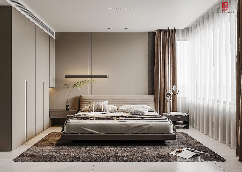在色彩搭配方面,主要以浅色调为主,如米白色的墙面和床品,搭配深棕色的窗帘和地毯,形成鲜明的对比,营造出温馨而稳重的氛围。