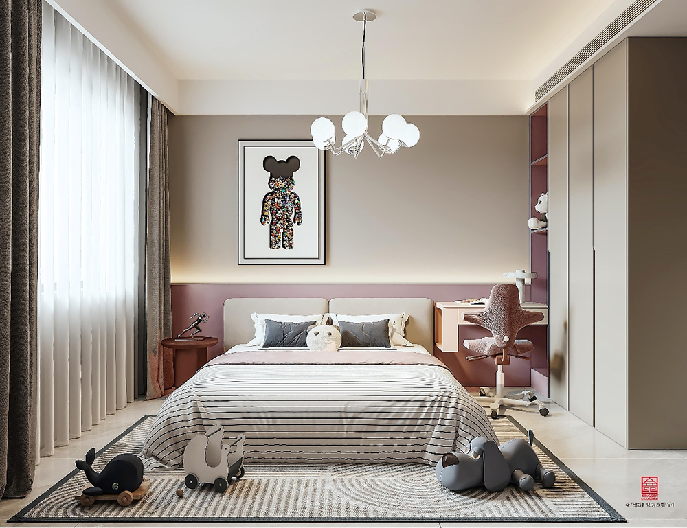 这个儿童房的设计充满了趣味与温馨。色彩搭配上,采用了柔和的粉色、米色和灰色,营造出一个温暖且舒适的环境。