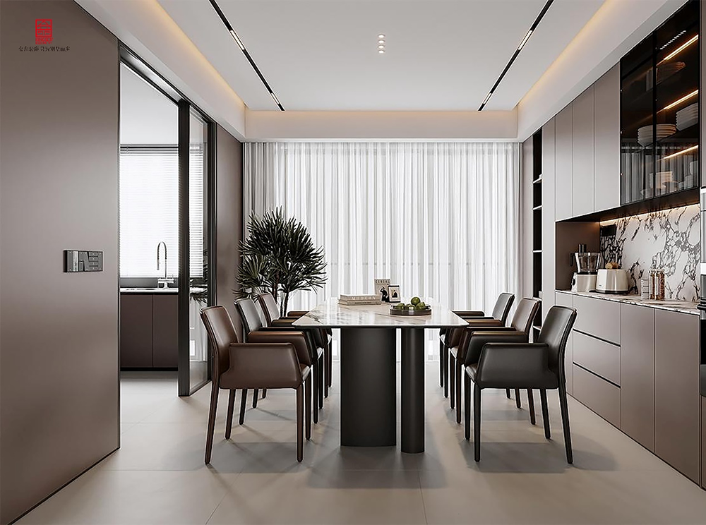 在细节处理上,餐边柜上的装饰品和绿植,为整个空间增添了一些生机和活力。天花板上的隐藏式灯光设计,不仅提供了充足的照明,还营造出温馨的氛围。