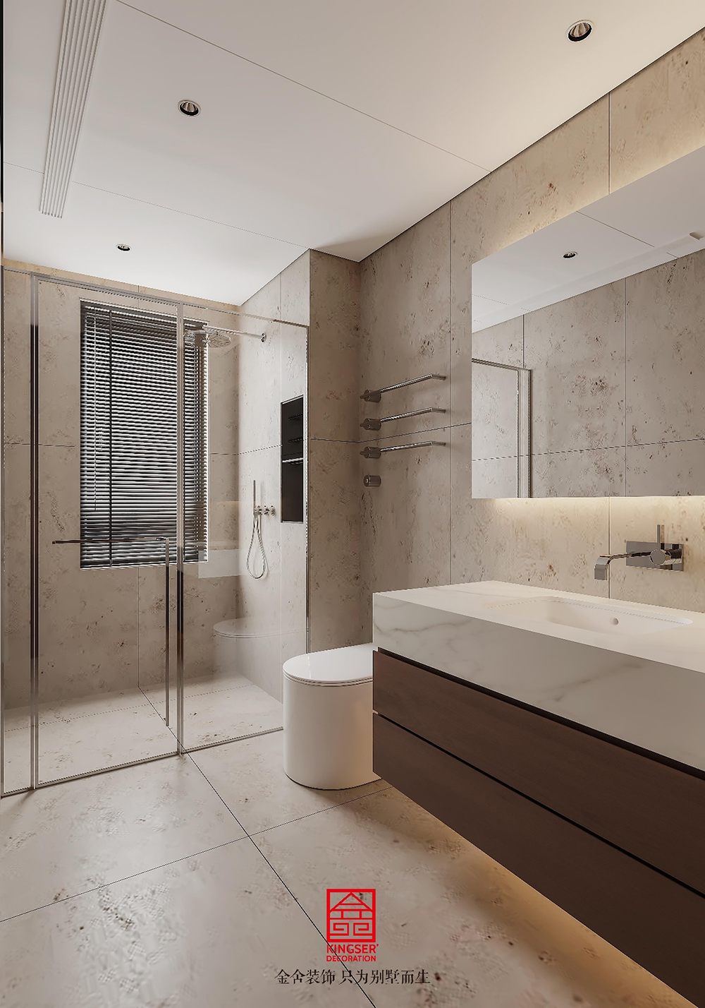 空间布局上,淋浴区、马桶区和洗手台区分明,动线流畅。淋浴区采用玻璃隔断,既保证了空间的通透感,又能有效防止水渍外溅。