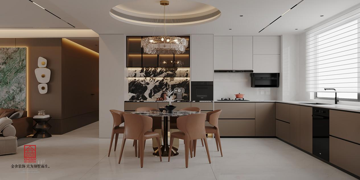意式轻奢餐厅设计,以低饱和暖调铺陈基底,钱灰色墙面搭配米灰餐边柜,奠定雅致基调。核心选用大理石餐桌,利落线条勾勒质感。上方悬一盏琥珀色玻璃吊灯,暖光漫射烘托用餐氛围,餐边柜摒弃繁复堆砌,在精致与松弛间找到平衡,尽显意式生活的浪漫仪式感。