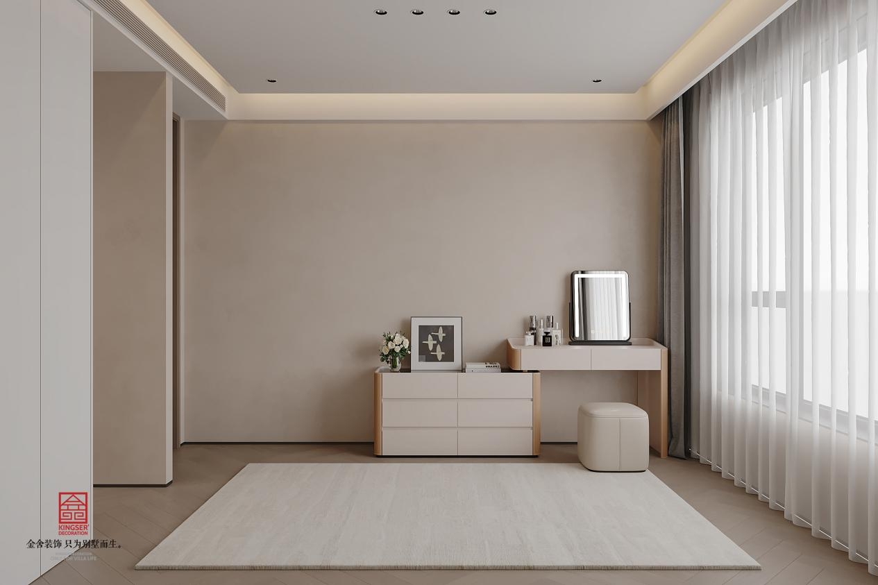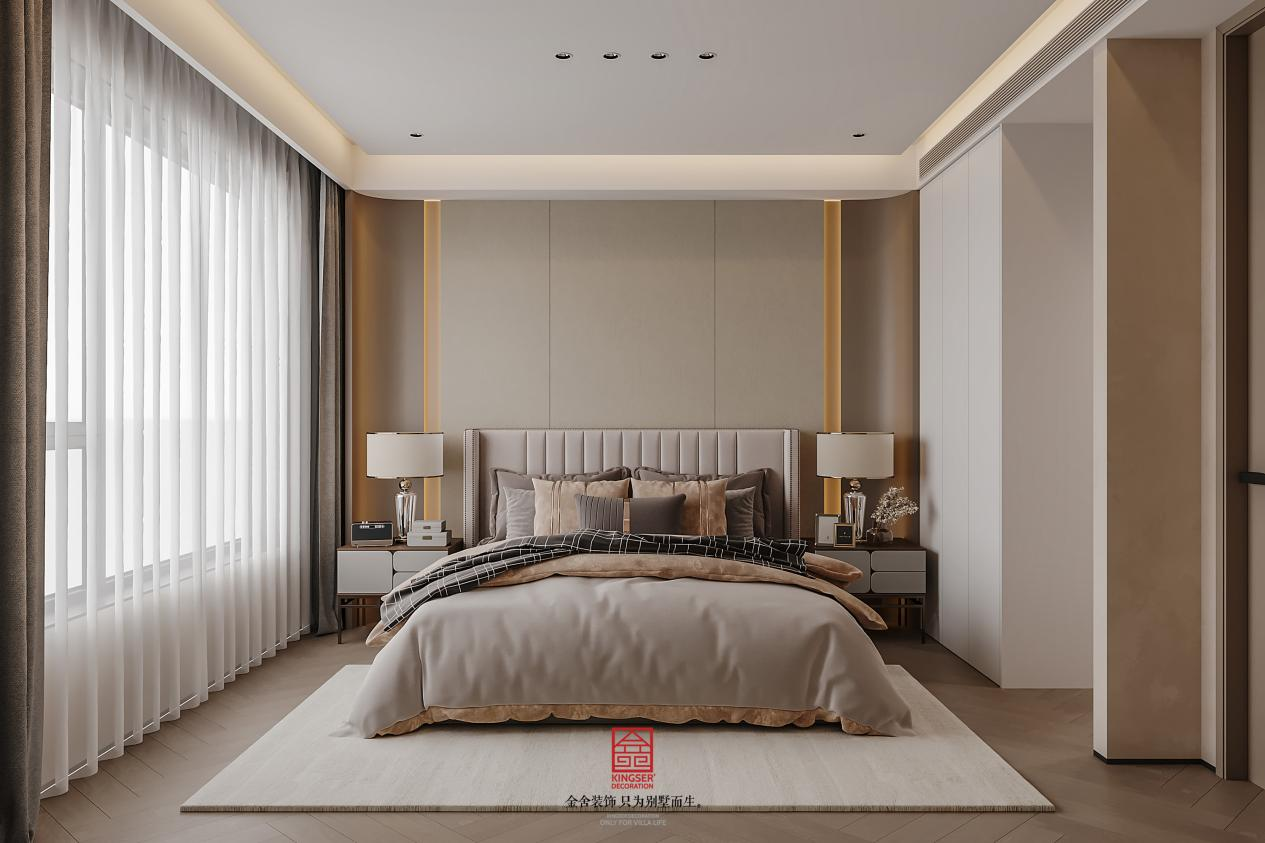 意式轻奢主卧设计,以低饱和暖调为基底,米灰墙面搭配驼色软包床头,奠定慵懒雅致的氛围。核心选用悬浮式床架,延伸空间通透感;侧边摆细腿金属床头柜,勾勒精致线条。