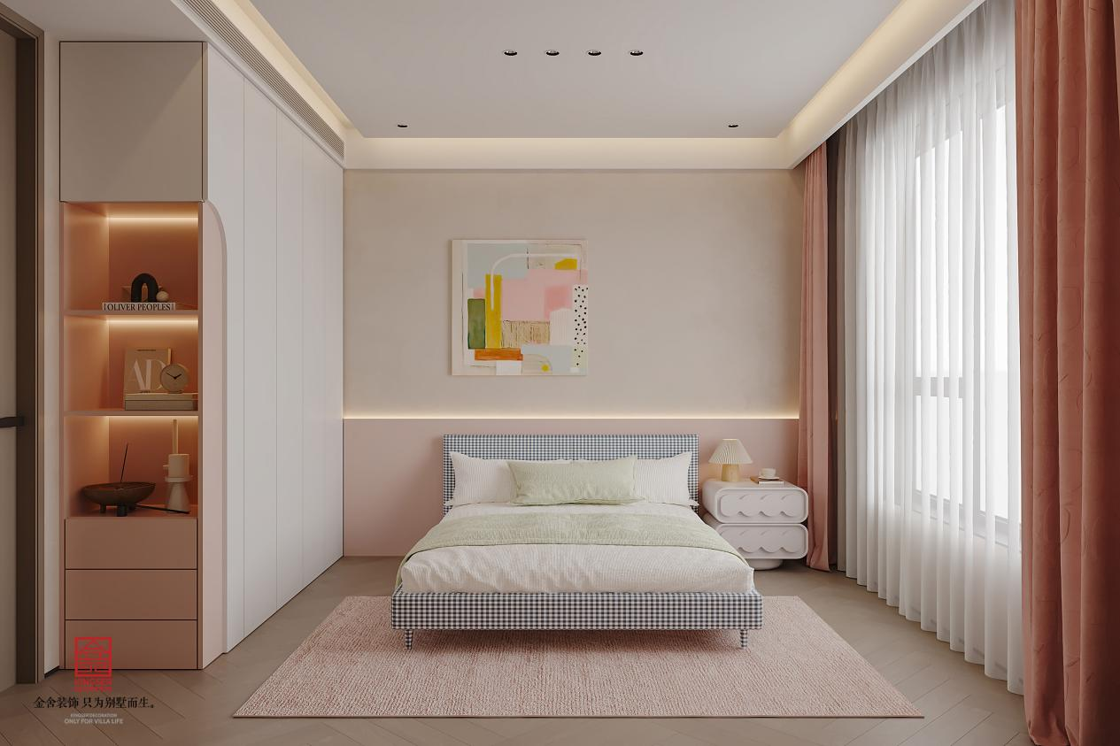 意式轻奢女孩房设计,以低饱和的奶油粉 + 米白为主调,弱化甜腻感,营造温柔雅致的氛围。选用软包靠背的床,搭配亲肤的针织床品,侧边立木质细框置物架,兼具收纳与展示功能。墙面留白,挂简约的装饰画,角落摆一张小巧的床头柜,搭配小巧台灯勾勒精致感。窗帘选垂坠的纱质面料,局部用毛绒地毯点缀,摒弃繁复堆砌,在少女感与轻奢格调间找到平衡,兼顾成长实用性与美感。
