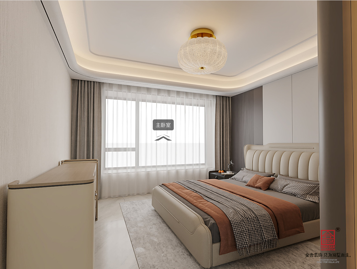 主卧以软包弧形床头与暖棕床品传递温润感,层次灯光弱化压迫感,双层窗帘平衡采光与私密性,打造静谧舒适的私享睡眠空间。