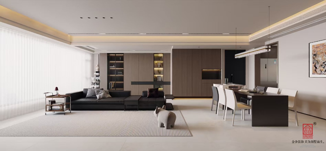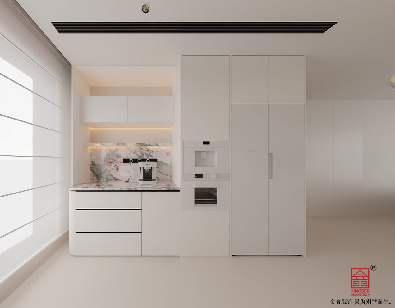 此餐厅设计呈现出现代简约风格。靠墙打造了一体化的白色柜体,包含多个抽屉与柜门,提供充足收纳空间。柜体中部设有开放格,内装灯带,下方是带有独特花纹的大理石背板与台面,台面上放置着咖啡机等设备,增添了生活气息。柜体嵌入了烤箱等电器,整体设计简洁大方,色调统一,注重功能性与美观性的结合,营造出整洁且实用的餐厅氛围。