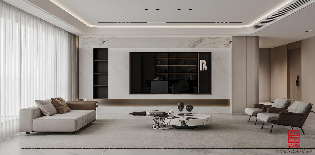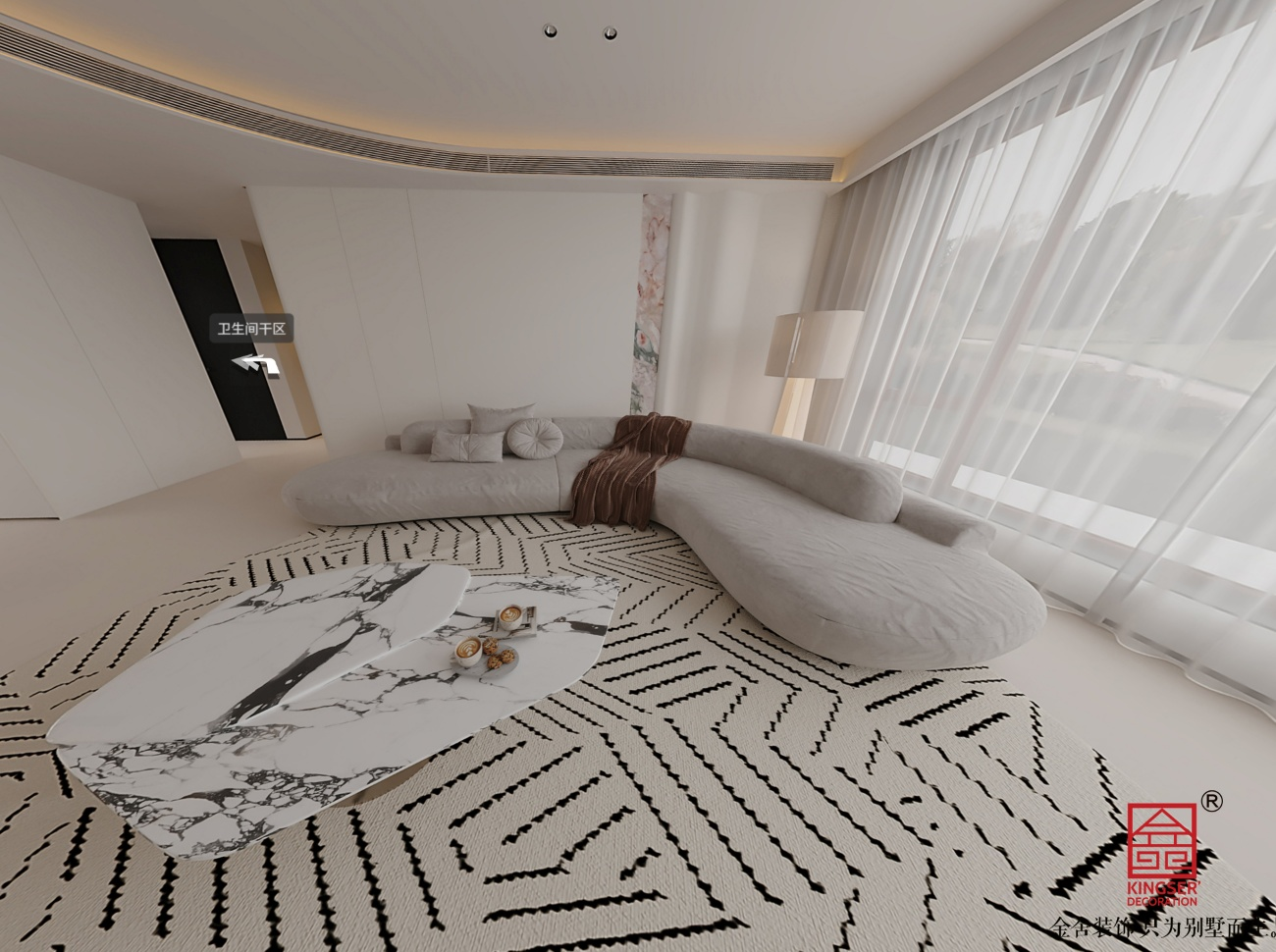客厅空间,采用开放式布局,以L型沙发为核心 seating 区,搭配大理石纹理茶几,形成清晰的会客休闲中心。利用大窗户引入自然采光,白色纱质窗帘柔化光线,保证空间通透感。左侧设置通向卫生间干区的门,在功能衔接上保持了空间的整体性与流畅性,无冗余隔断阻碍动线。