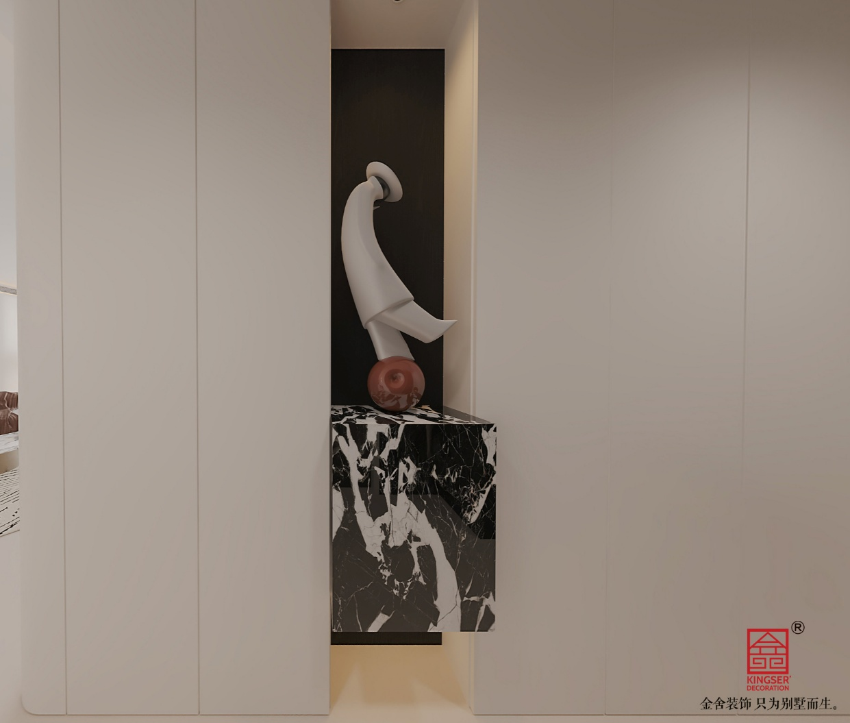 以大面积白色作为空间基底,利用黑白大理石纹理的自然对比丰富视觉层次,再以点缀的红色球体作为色彩跳点,打破空间单调感,实现简约而不简单的色彩平衡,让空间既保持纯净又富有活力。延续现代简约设计风格,摒弃繁杂冗余的装饰,通过简洁的线条和规整的造型塑造干净利落的空间气质。