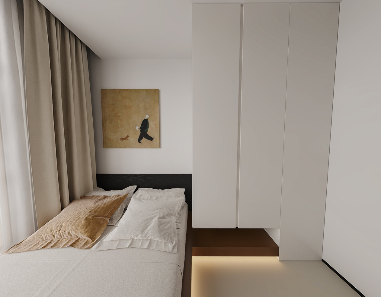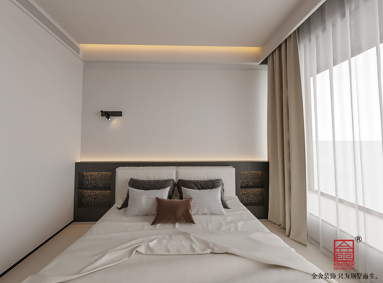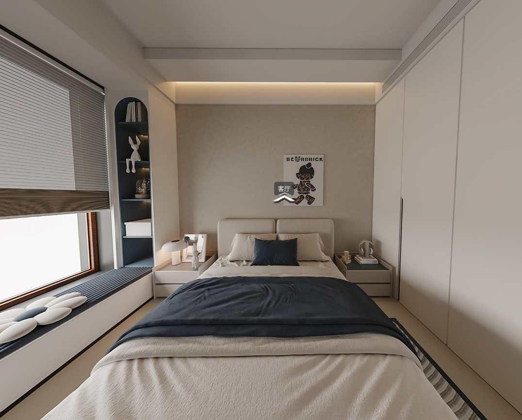本主卧设计秉持现代简约的核心设计理念,致力于打造一个简约而不简单、舒适且兼具功能性的睡眠空间。摒弃了繁杂的装饰元素,以简洁的线条、纯粹的色彩去营造一种宁静、放松的氛围,让居住者在忙碌的生活之后,能够拥有一处可以彻底卸下疲惫、回归内心平静的私密领域。