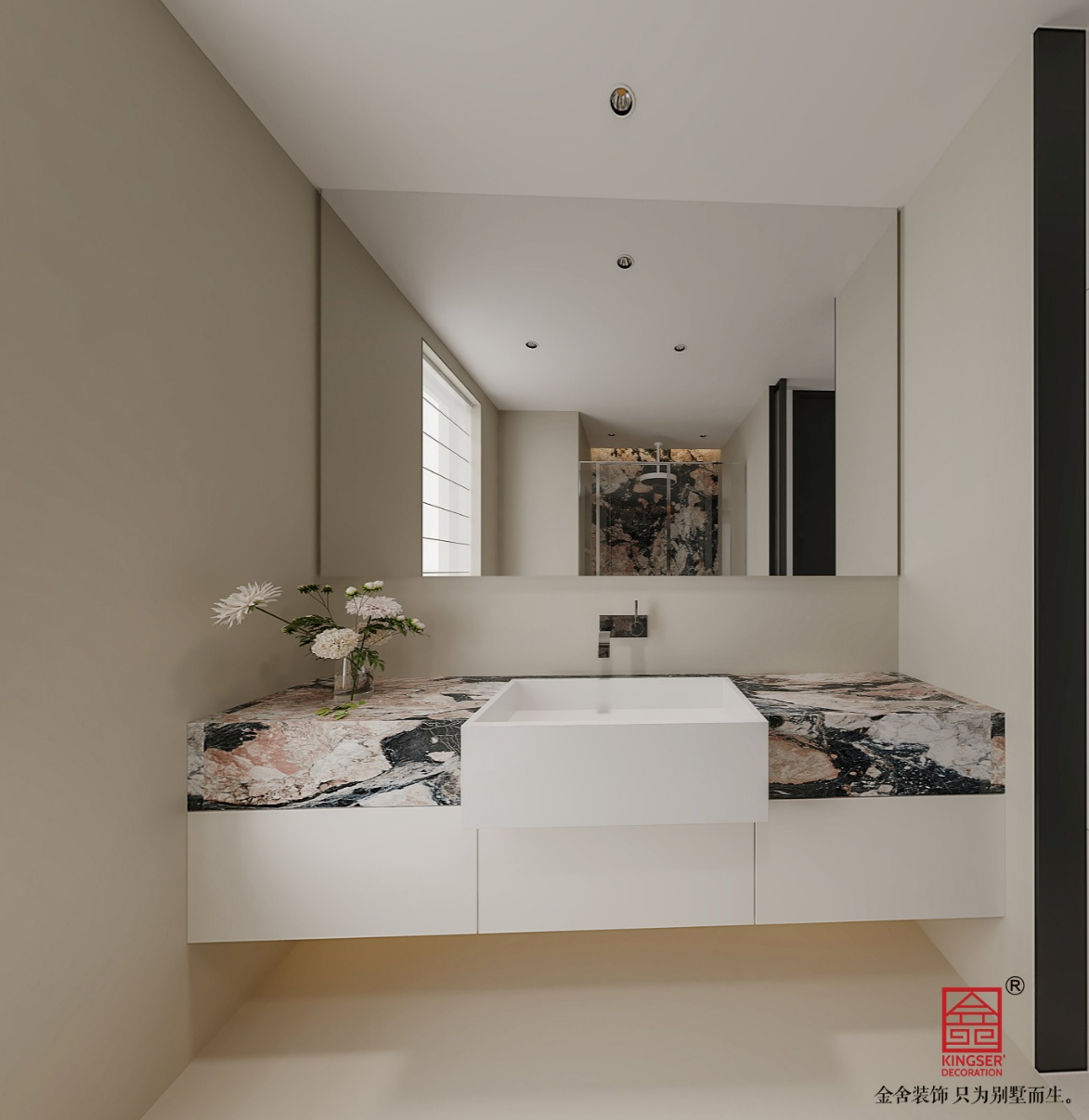 此卫生间设计展现出简约与精致的风格。洗手台区域,白色悬空柜体搭配具有黑、粉、白相间花纹的大理石台面,时尚且有质感,台面上摆放着插有白色花朵的花瓶,增添了一丝自然气息。上方安装了大幅镜子,扩大了空间感,镜子反射出后方带有独特花纹的墙面,隐约可见淋浴区域,整体设计简洁大方,色调和谐统一,注重细节装饰与空间利用。