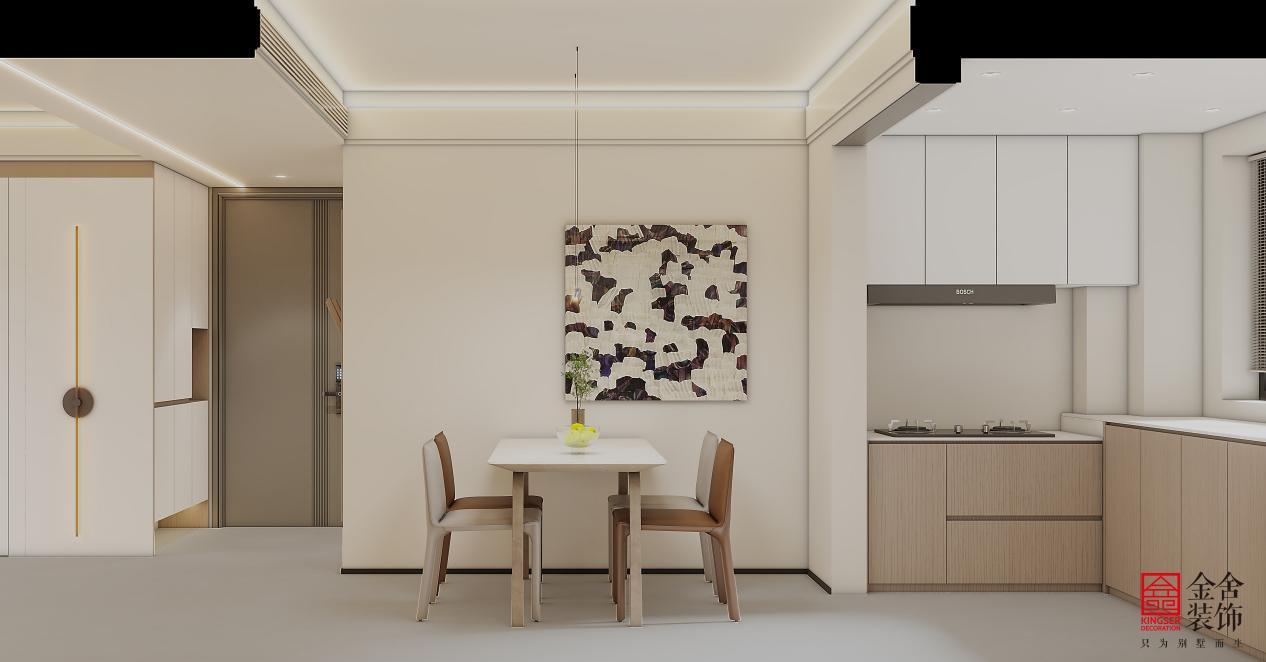 厨房采用一体化设计,以哑光白与深灰橱柜构成清晰视觉分区。嵌入式家电保持台面整洁,隐藏式收纳最大化利用空间。设计强调动线流畅与高效机能,在极简形态中实现烹饪、存储与交流的完美融合。