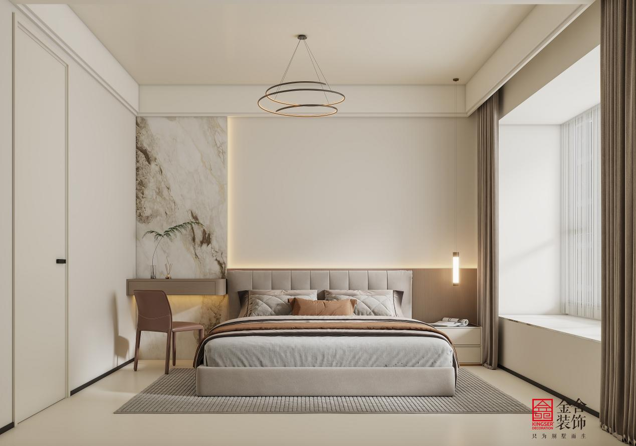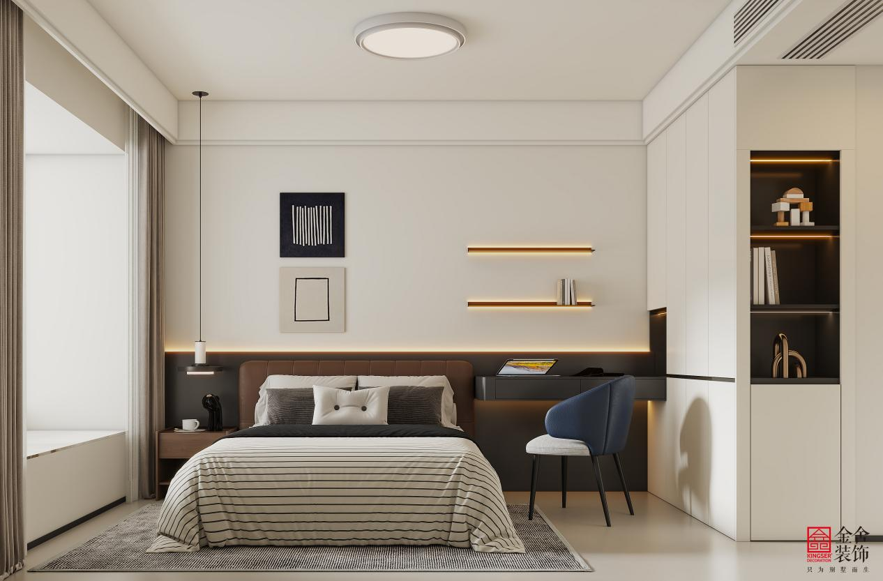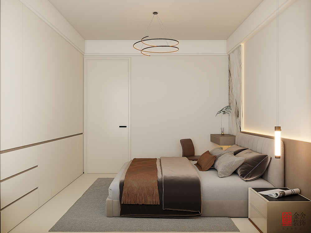 主卧设计延续简约理念,以低饱和度的米灰与咖色营造舒缓静谧的休憩氛围。悬浮床体与通顶衣柜强化空间感,并满足强大收纳需求。隐形灯带与床头吊灯提供柔和无眩光照明。摒弃多余装饰,通过材质本身的肌理与色彩变化,打造一个令人彻底放松的私属领域。