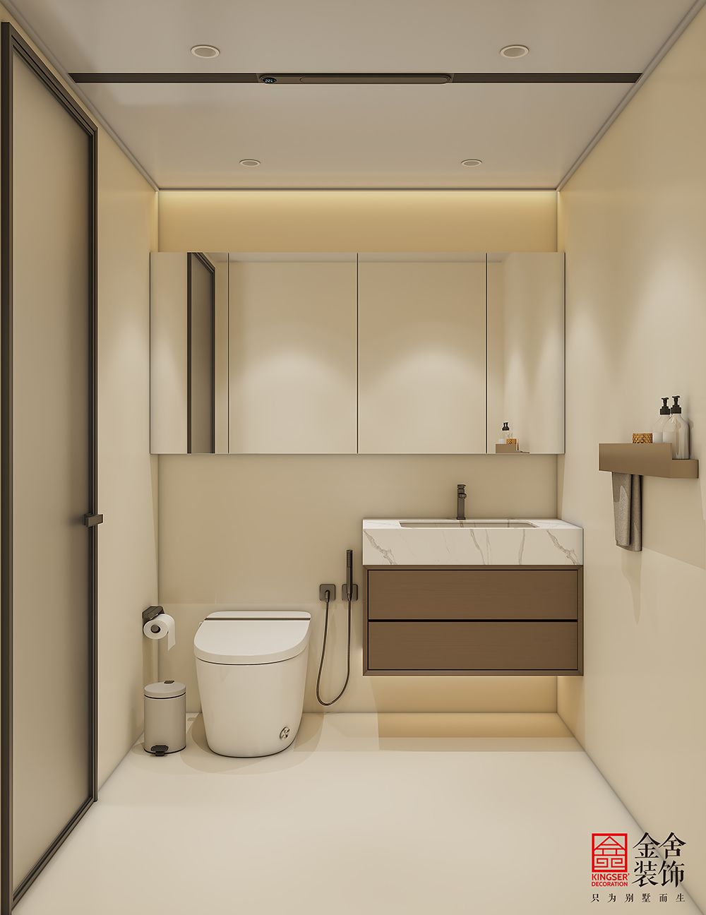卫生间设计强调功能的纯粹与形式的简化。采用墙地一体材质,塑造无缝整体感。悬空式洁具与柜体减少卫生死角,视觉更显轻盈。嵌入式龙头、线性地漏与隐蔽式收纳保持界面整洁。干湿分离布局清晰,顶面漫反射光与局部重点照明结合,于极简的体块关系中,营造出明亮、实用且易于打理的空间。