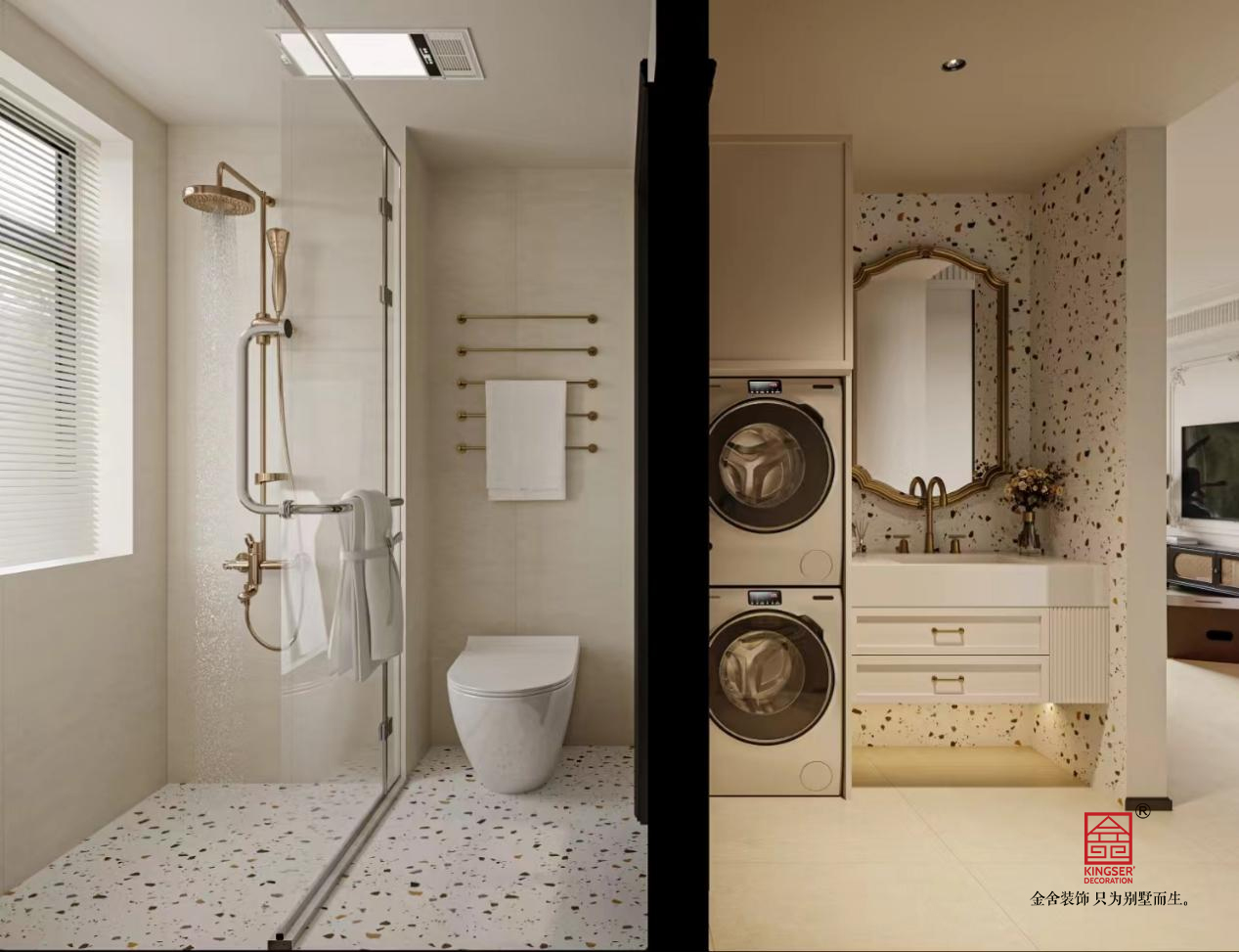 卫生间的洗手池设计巧妙地实现了干湿分离的同时,兼具梳妆台的功能。让业主在洗漱化妆的同时,尽享专属的私密空间。优雅的洗手池和镜子搭配,营造出舒适而精致的氛围,满足了业主对于细节和实用性的追求。